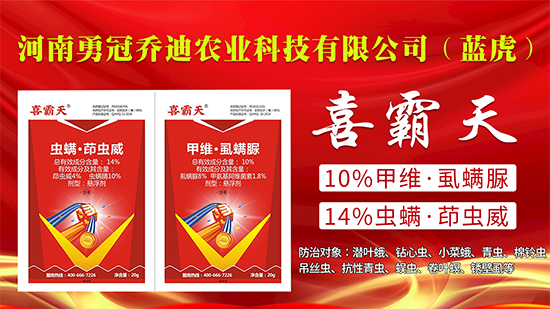 河南勇冠喬迪農(nóng)業(yè)科技有限公司(藍(lán)虎)【10%甲維·虱螨脲+14%蟲螨·茚蟲威-喜霸天】本品由兩種具有不同作用機制的殺蟲有效成分混配而成,適于害蟲綜合治理及抗性管理;具有胃毒、觸殺作用,且具有一定的殺卵作用,滲透性強,殺蟲速度快,持效期長,耐雨水沖刷。