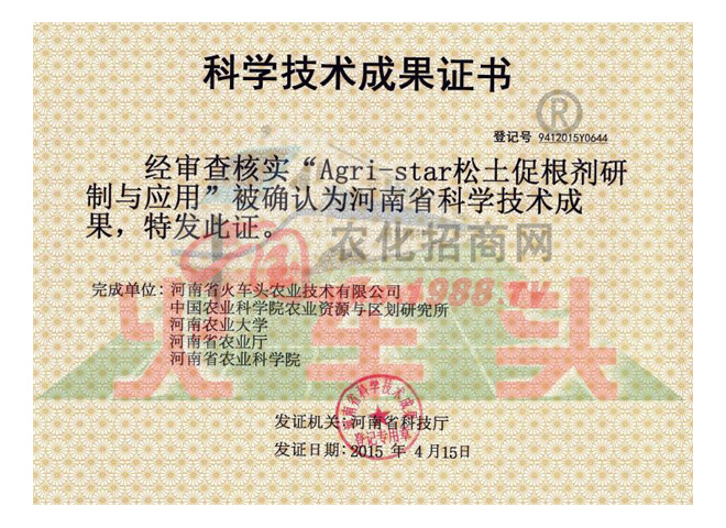 2015年松土促根劑項(xiàng)目經(jīng)河南省科技廳組織專家組進(jìn)行鑒定,達(dá)到國際先進(jìn)水平,國內(nèi)外沒有同類報道,被科技日報譽(yù)為“修復(fù)土壤的保護(hù)神”;